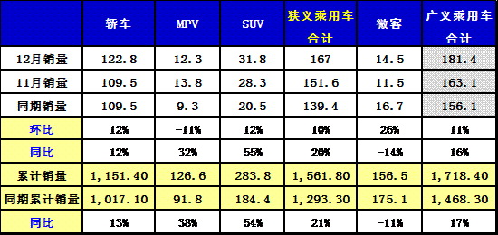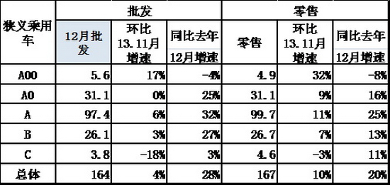 根據全國乘聯會數據:狹義乘用車12月批發167.33萬臺,12月批發較去年同期同比增長30.2%,12月零售較去年同期同比增長22.2%;12月批發環比上月增長6.2%,12月零售環比上月增長12.4%;12月出口較去年同期同比增長30.6%;12月廠家產銷率101%,12月渠道批零率3282%;13年1-12月生產累計增幅20.2%,13年1-12月廠家批發銷售累計增幅19.9%。