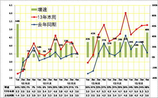 13年12月的車市零售增長出現前低后高的局面,下旬的市場增長較為迅猛,尤其是12年的12月月末相對走弱,13年的12月中旬較強,下旬也是大幅走強。由于地方限購政策的傳言愈演愈烈,而霧霾天氣的安全角度也是開車出行更好,因此12月的下旬市場走強較明顯。
