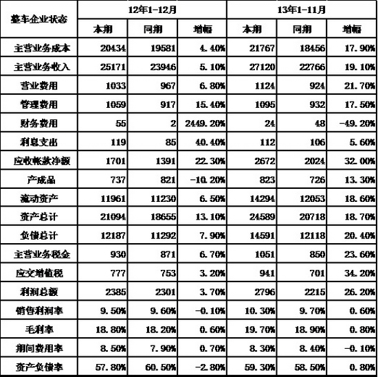 由于國家統計局的行業經濟運行的總體數據發布要晚一個多月,因此我們本月只能進行隔月的月度跟蹤汽車整車總體運行狀態。國家統計局統計的12年1-12月的的汽車整車行業的產量2063萬臺,同比增長6.3%,而整車行業產值24609億元,增長9.2%。13年1-11月的主營業務收入271202億元,增長19%,而成本增長17.9%,生產運營處于較好水平。但營銷的投入增長也是很大的。13年的營業費用增長21.7%,較12年的6.8%增長較大。同時13年的財務費用的收入大減到24億元,好在是利息的增長不太大,企業的資產負債率較12年同期增長0.8個百分點到59.3%,處于較安全水平。