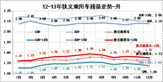 13年的狹義乘用車排量趨于中大型化,低端小排量市場表現相對較弱。尤其是SUV市場的份額增大帶動總體排量的提升較明顯。SUV自身是趨于排量小型化趨勢,而轎車排量相對是大型化的趨勢,MPV的低端微客類車型占比不斷上升也促進排量小型化。排量大型化和消費向SUV升級是近期的趨勢,但秋冬季的入門及消費帶動排量下移也是趨勢,12月排量為1.75升,較7月的1.79升下降較大。