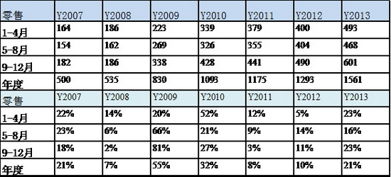 13年1-12月的車市零售增長21%,這是11、12連續兩年低增速后的,算是較快增速。13年1季度的開門紅早在我們的預期中,這是考慮到12年初的數據異常低基數和13年春節延后因素,以及12年4季度的車市增長部分轉移到13年1季度。而今年5-8的16%增速是在去年14%增速基礎上的較高增長。9-12月的增速23%是近期超強的,雖有基數原因,但也是三包與節能車政策交錯期的消費梯度釋放,同時也是日系恢復和12月的車市限購恐慌消費和年前高增長的多方組合。