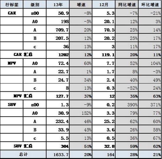 13年1-12月的零售增長21%是較強的。其中的SUV年累計增速仍達到54%,也是超強的增長,而MPV增速的38%也是明顯強于轎車增速,說明車市增長的結構性走強是多元促進的。