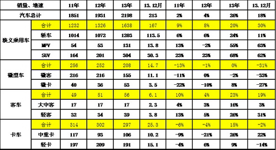 根據全國乘聯會數據,13年狹義乘用車同比增長20%,而12月的增速是30%,12月異常火爆。總體看狹義乘用車的增速在15%左右是較正常的,13年的12月增速是異常不可持續的。