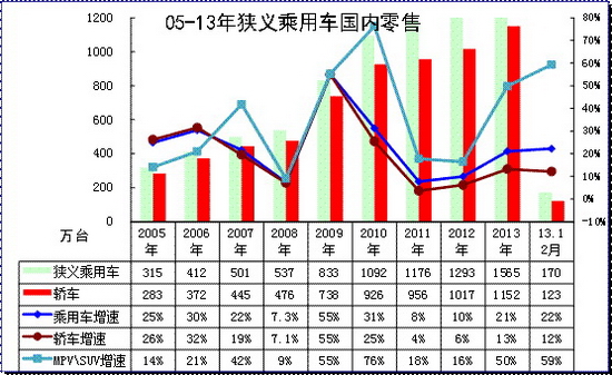 根據全國乘聯會數據,2013年1-12月的中國狹義乘用車綜合零售銷量1395萬臺,增速為21%;由于11年和12年增速都在8-10%之間,處于近8年來的增速谷底,13年車市零售走強有前兩年的底部支撐。