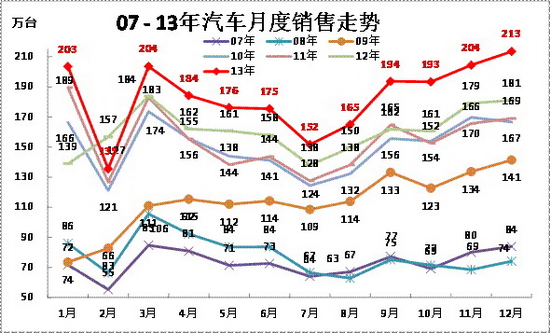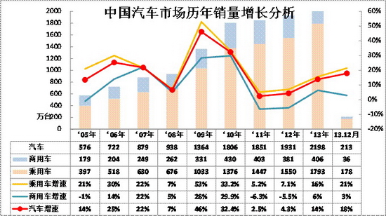 根據中國汽車工業協會數據,2013年1-12月的中國汽車累計批發量2198萬臺,增速為14%,較12 年累計增速增加10個百分點,這主要是12年日系低迷因素的基數偏低。