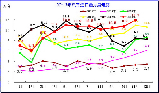 根據全國海關統計,2012年中國汽車整車進口113萬臺,增速9%,增長動力減弱。13年1-11月整車的進口107萬臺同比增速2%,進口在連續7個月暴跌后6月開始逐步回暖,7-10月基本保持穩定,11月大幅回暖。相對前幾個月減庫存狀態,11月的11.9萬臺的進口車持續說明需求相對恢復,零售目前也在10萬臺左右。