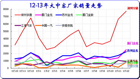 13年初春節(jié)因素的影響下的大客市場銷售出現(xiàn)季節(jié)性下滑,但由于柴油國四該實施的機(jī)會促進(jìn),6月的大客的市場暫時暴增,但新能源車補(bǔ)貼尚未出臺,加之校車等需求相對弱化,8-11月的大客市場相對低迷,12月的年末的銷售高潮出現(xiàn),全國性霧霾導(dǎo)致改用清潔燃料的大客的需求仍是較大的。