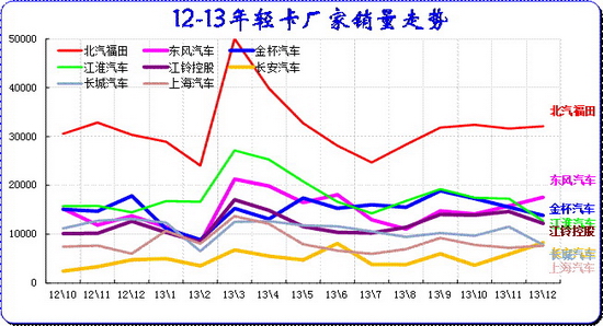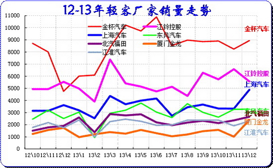 13年春節(jié)后的輕客走勢較強(qiáng),主力企業(yè)小幅增長,二線企業(yè)大幅走強(qiáng)。8-12月的金杯平穩(wěn),江鈴走勢持續(xù)走強(qiáng)。而福田和廈門金龍的輕客走強(qiáng),電商物流帶動中低端輕客表現(xiàn)較好。