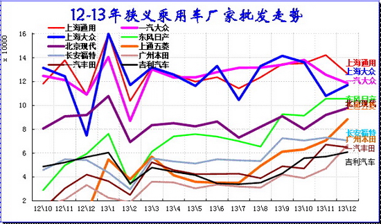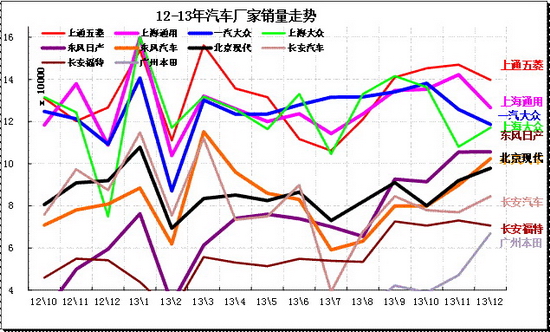 13年狹義乘用車銷量1637.8萬臺,累計增速19.9%;13.12月狹義乘用車銷量167.33萬臺,同比增長30.2%,環(huán)比增長6.2%。。13年12月的主力長銷量走勢仍是集群化特色較明顯,南北大眾和上海通用仍是核心的一陣營,日產(chǎn)和現(xiàn)代是二陣營,長安福特同比增37%屬強(qiáng)勢跟進(jìn),其他幾家合資企業(yè)也是環(huán)比微增。