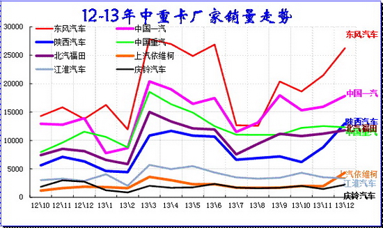 由于今年春節(jié)晚,3月的中重卡才開始節(jié)后沖量,2季度的中重卡走勢超強(qiáng)。7-8月的中重卡大幅回落,但隨著投資增長和環(huán)保標(biāo)準(zhǔn)提升,9-12月的中重卡又有一定的回升。12月的東風(fēng)和陜汽的增長較強(qiáng),重汽也是表現(xiàn)不錯。但年末高增長不正常,這透支14年需求。