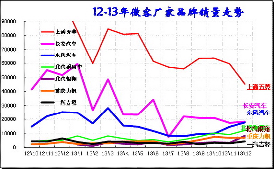 13年微客銷量155.35萬臺,累計增速-2.3%;13.12月銷量11.15萬臺,同比增長-32.9%,環(huán)比增長-4.2%。微客市場主力廠家全力轉(zhuǎn)型到MPV市場,部分微客高端需求也轉(zhuǎn)移到MPV,因此主力廠家表現(xiàn)相對較差。