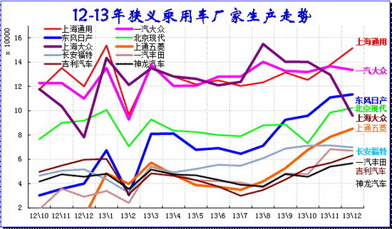 13年12月的廠家產(chǎn)銷競爭仍是較激烈的,走勢差異性大。日系主力企業(yè)相對12年同期逐步恢復(fù)元氣,東風(fēng)日產(chǎn)持續(xù)超越北京現(xiàn)代的生產(chǎn)量。南北大眾的12月產(chǎn)量相對11月平穩(wěn),但一汽大眾的產(chǎn)量僅同比增9%,上海大眾增22%。 日系的東風(fēng)日產(chǎn)和豐田、神龍、廣本都是環(huán)比11月的產(chǎn)量稍有增長,說明日系的增長是恢逆周期擴(kuò)張。一汽豐田本月拉升較猛。