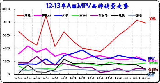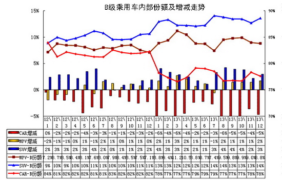 每年3月開始的SUV份額上升,12年和13年的3-7月的SUV占比都是持續上升。12年的8月開始SUV份額下降,而 13年8月到12月的SUV份額相對穩定,這樣的趨勢也導致12月的SUV份額達到24%,同比增長4.6個百分點。而MPV的份額持續小幅下降。