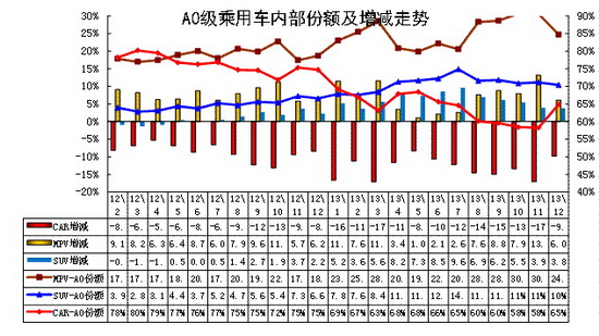 A0級狹義乘用車12月批發34.5萬臺,12月占狹義乘用車批發份額20.62%,較去年同期份額增加1.27%,12月批發較去年同期同比增長39%,12月零售較去年同期同比增長29%;12月批發環比上月增長10%,12月零售環比上月增長21%;12月出口較去年同期同比增長40%;12月廠家產銷率100%,12月渠道批零率2225%;13年1-12月生產累計增幅14%,13年1-12月廠家批發銷售累計增幅15%。。