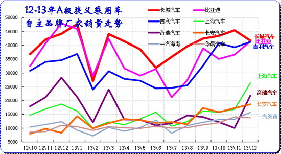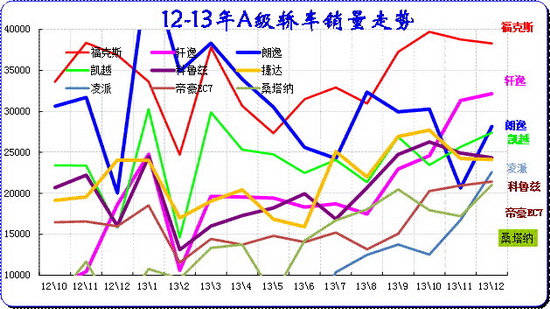 A 級車是合資企業超強的主力細分市場,主力廠家在此表現較強,尤其是9-12月的市場高潮期的A級車必然暴增,今年的合資主力企業增長相對去年稍好,去年過于保守。今年12月的主力廠家僅上海通用銷量稍有下降,其他廠家基本保持11月的水平。