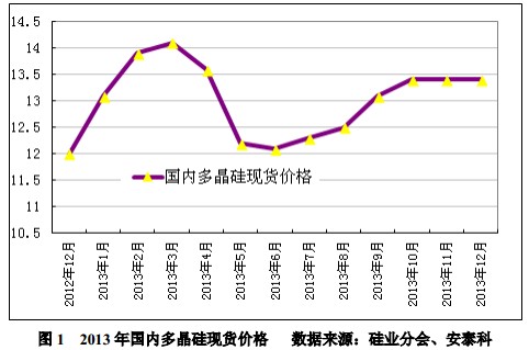 一、企業紛紛復產。受我國對美韓“雙反”初裁利好,到2013年底,國內大約有13家多晶硅企業恢復生產,國內開工率達 30%以上。二、國外傾銷依舊。2013年1-11 月我國進口多晶硅量累計達7.2 萬噸,預計全年進口量達7.9 萬噸。進口均價方面,2013年1-11 月我國多晶硅進口均價為18.71 美元/千克,同比下滑 27.4%。可見國外傾銷依舊持續。三、價格低位徘徊。受國外傾銷影響,全國內多晶硅現貨交易均價降至13 萬元/噸,同比下滑 16.7%。四、下游需求向好。國內光伏配套政策陸續出臺,國內光伏市場規模逐步啟動,預計全年光伏安裝量在9GW 左右。