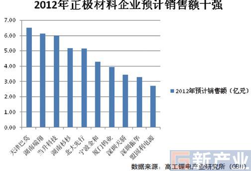 2011年,盡管大陸正極材料企業(yè)整體產(chǎn)量增長超過25%,但由于價格下跌,市場規(guī)模卻萎縮近2%。(圖3:2011年銷售額前十大正極材料企業(yè))天津巴莫強勢崛起2012年,主要受智能手機、平板電腦、電動自行車等應(yīng)用市場需求增長帶動,鋰電池產(chǎn)量快速增長,相應(yīng)地帶動正極材料產(chǎn)量的增長,但正極材料價格卻延續(xù)了2011年的下跌走勢,最終結(jié)果是正極材料市場規(guī)模僅有小幅增長。