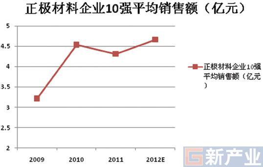 2009-2012鋰電正極材料企業(yè)銷售額前10強的榜單顯示出很強的穩(wěn)定性,盡管排名有所不同,但是有9家企業(yè)同時登上2012與2009榜單。同時,前10強的銷售總額占我國正極材料市場規(guī)模的比重也維持在83%左右。這都顯示出最近幾年內(nèi)我國正極材料的競爭格局并未發(fā)生根本性的變化,而中小企業(yè)要想躋身10強困難重重。(圖5:2009-2012正極材料企業(yè)10強平均銷售額及預(yù)期)