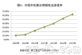 據高工鋰電產業研究所(G B I I)統計,2 0 0 9年,聚合物鋰離子電池在手機電池中的應用比例為10.7%,而到2012年,聚合物鋰離子電池的應用比例已經達到了32.5%。預計在未來的幾年中,隨著國內3G市場的逐步成熟,以及智能手機滲透率的快速上升,聚合物鋰離子電池將是未來手機電池中的主流,而相應的也將帶動其市場滲透率的快速上升。到2015年,聚合物鋰離子電池在手機中的應用比例將達到63.5%。(圖4)