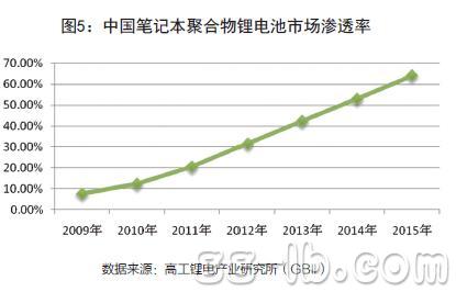 據高工鋰電產業研究所(GBII)統計,2009年全球筆記本電池采用聚合物電池的比例僅為7.6%。到2012年,聚合物鋰離子電池在筆記本電腦中的滲透率已經達到了31.5%。預計,聚合物鋰離子電池的市場滲透率在2015年將達到64%。(圖5)聚合物鋰離子電池作為未來幾年數碼電池發展的方向,這將給鋰電池的發展帶來很大的影響。因為,在動力鋰電池、大型儲能市場還未大規模打開的情況下,手機電池仍然將作為鋰電池的最為主要的應用領域。同時,手機鋰電池應用結構的變化,將毫無疑問給其他數碼產品鋰電池的的應用結構帶來影響。