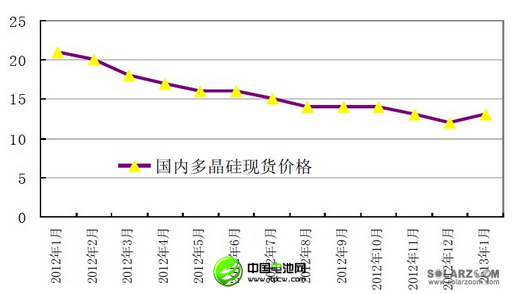 2012年12月底多晶硅價格觸底11.5-12.5萬元/噸,2013年1月初開始多晶硅光伏各類產(chǎn)品價格開始出現(xiàn)止跌反彈的現(xiàn)象,其中單晶產(chǎn)品率先反彈,隨后幾周內(nèi),受需求回暖、下游企業(yè)主動停產(chǎn)及對美韓雙反等幾大因素影響,全產(chǎn)業(yè)鏈價格上漲幅度擴大,硅片、電池片、組件價格全面上漲,業(yè)內(nèi)人士紛紛對2013年需求展望持樂觀態(tài)度,樂觀氛圍提振業(yè)者信心,中下游企業(yè)醞釀調漲報價,因此2013年多晶硅價格上漲并非空穴來風。