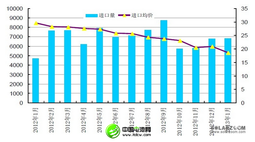 據(jù)最新海關統(tǒng)計數(shù)據(jù)顯示,2013年1月我國多晶硅進口量為6791噸,環(huán)比微幅增長,同比增加12%;進口單價方面,1月份多晶硅進口均價創(chuàng)歷史新低,大幅下挫至18.47美元/千克,環(huán)比下降11.58%,同比下降41.5%,較2012年全年均價下滑27.17%。