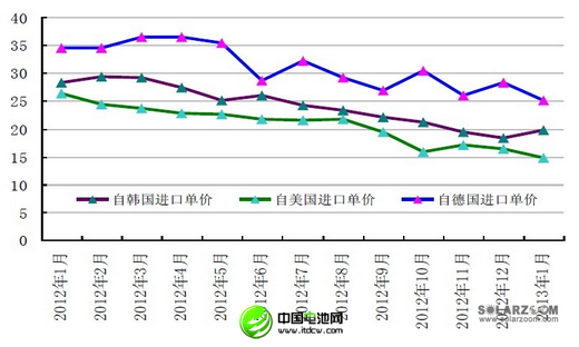 從三大進口國進口單價來看:2013年1月德國和美國的進口單價較2012年12月出現(xiàn)不同程度下滑,分別為24.99美元/千克和14.70美元/千克,而韓國的進口單價回升到19.79美元/千克,自美國進口多晶硅單價在2013年1月份仍居三國之中最低位并又創(chuàng)歷史新低。
