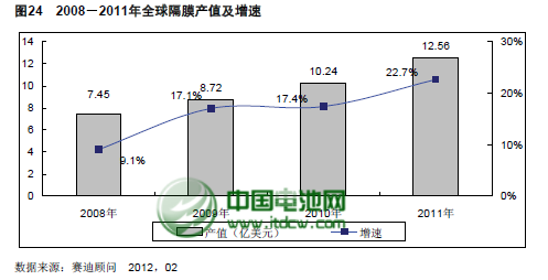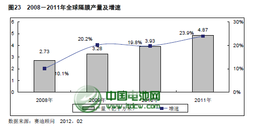而隨著儲能電站、電動自行車以及新能源汽車的逐步產(chǎn)業(yè)化,對鋰離子電池的需求將逐步增加,從而可以帶動全球隔膜產(chǎn)量的增長率將有更大幅度的增長空間。