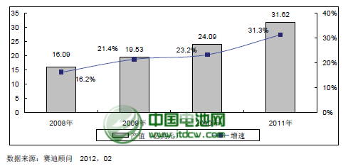 中國范圍來看,作為世界上最大的鋰電池生產(chǎn)制造基地和第二大鋰離子電池生產(chǎn)國和出口國,中國對隔膜的需求日益增加。2007年,中國隔膜的市場規(guī)模僅為13.85億元,在中國優(yōu)良的投資環(huán)境和相對低廉的人工成本的作用下,未來幾年鋰離子電池產(chǎn)業(yè)在全球范圍內(nèi)向我國轉(zhuǎn)移的趨勢將越來越明顯,從而帶動整個隔膜的市場規(guī)模快速增長,2011年中國隔膜產(chǎn)業(yè)的市場規(guī)模達(dá)到31.62億元,同比增長31.62%。