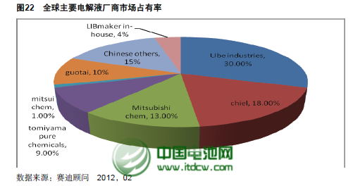 目前,全球鋰離子電池電解液的供應商主要集中在中日韓三國。日本電解液的主要供應商是宇部興產(基本供給日本三洋)、三菱化學、富山藥品工業等,主要供給日本本土以及部分在華日資企業;韓國電解液的主要供應商是韓國三星,主要供應韓國本土企業和部分在華韓資企業。
