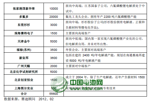 隨著新能源汽車產業化浪潮的逐步到來,鋰離子電池的巨大市場空間帶動了整個上游電池材料產業的快速發展,就電解液而言,受益于下游需求的擴張,整個電解液產業呈現出產銷兩旺的局面。從產能來看,中國主要電解液生產商均在大張旗鼓的擴大產能,拒不完全統計,截止到2011年底,中國主要電解液廠商的產能合計達到55600噸。