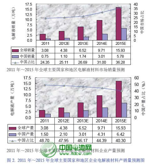 雖然從絕對量上看會表現不錯,但現在中國電池網-中國電池雜志戰略合作機構——真鋰研究依然認為,中國企業電解液產銷量的全球占比,將從2011 年的48.70%下降到2015 年的40.30%。真鋰研究的主要考慮因素是:動力鋰離子電池市場份額的快速增長以及人們對電動汽車安全因素的更加重視,技術水平普遍不高的中國電解液企業在這個市場要取得好成績會很困難。盡管如此,到2015 年,中國電解液材料企業的產量總體上還是能夠滿足中國鋰離子電池企業的需求。