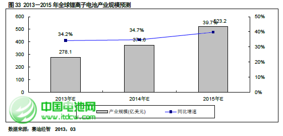 預計到2013 年全球鋰離子電池產業規模將達到278.1 億美元,2015 年,新能源汽車的產業化應用將帶動全球鋰離子電池的產業規模達到523.2 億美元。