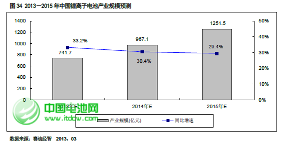 就中國市場而言,得益于動力鋰離子電池的快速發展,2013 年鋰離子電池整體市場規模將達到741.7 億元,同比增長33.2%,并且未來三年市場規模增速均會保持在30%以上,到2015 年整個中國鋰離子電池的市場規模將突破1000 億元,達到1251.5 億元。