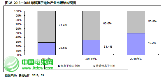 從鋰離子電池市場結構來看,賽迪顧問認為鋰離子市場規模未來三年內增長的動力來自于以新能源汽車電池為代表的動力電池。到2015 年鋰離子動力電池市場規模占比將達到49.2%。