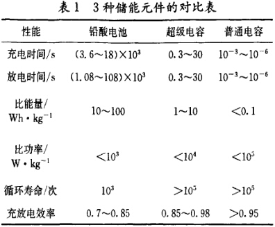 超級電容具有極其優良的充、放電性能,在額定電壓范圍內,可以以極快的速度充電至任一電壓值,放電時則可以放出所存儲的全部電能,而且沒有蓄電池快速充電和放電的損壞問題。此外,超級電容還具有不污染環境及機械強度高、安全性好(防火、防爆)、使用過程中免維護、使用壽命長(大于10年)和工作溫度范圍寬(一30℃~ 45℃)等優點,并且在瞬間高電壓和短路大電流情況下有緩沖功能,能量系統較為穩定。超級電容與鉛酸電池和普通電容的性能對比見表1。