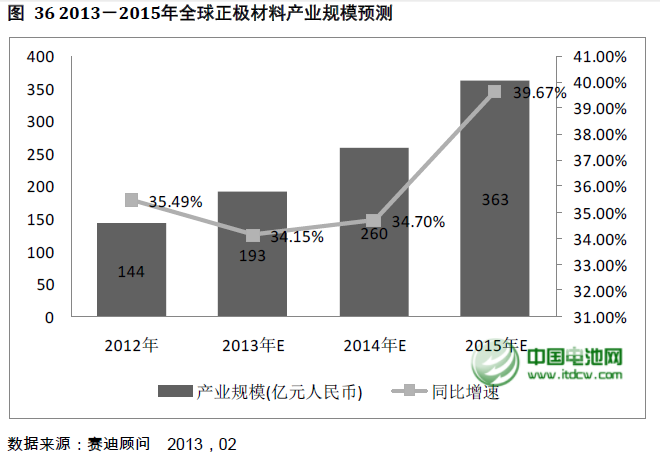 中國電池網-中國電池雜志戰略合作機構——賽迪顧問預計到2013年全球正極材料產業規模將達到193億元人民幣,2015年,新能源汽車的產業化應用將帶動全球鋰離子電池的產業規模達到363億元人民幣。