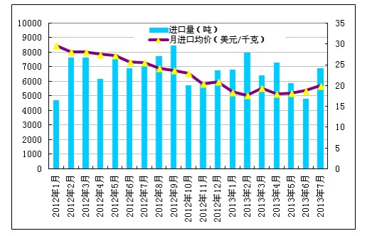 圖 2 2012 年-2013 年 7 月多晶硅進口量及進口均價示意圖 數據來源:海關
