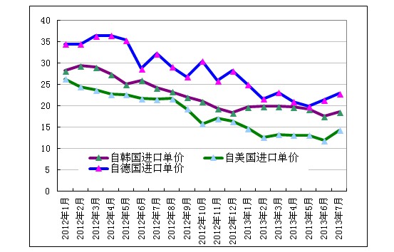 從 2013 年 7 月份三大多晶硅出口國出口單價來看:韓國 18.55 美元/千克、美國 14.28 美元/千克、德國 22.89 美元/千克。2013 年 1-7 月多晶硅進口均價為18.62 美元/千克,其中 1-7 月從韓國進口均價為 19.32 美元/千克,1-7 月從德國進口均價為 21.96 美元/千克,1-7 月從美國進口均價為 13.48 美元/千克。從價格走勢看,2013 年 7 月份從韓國、美國和德國進口多晶硅均價都有不同程度上漲,其中美國漲幅最大,突破 14 美元/千克,到達 14.28 美元/千克,這與此次“雙反”對美國初裁稅率相對韓國較高有很大關聯,因此受初裁影響,來自美國的傾銷似有所減弱。
