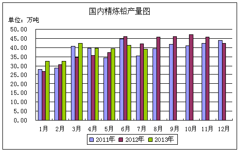 國家統計局數據顯示,2013年1-8月份我國鉛精礦產量為201.61萬噸,同比下降4.64%,其中8月份產量為28.43萬噸,同比下降8.94%。