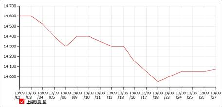 2013年9月份,上海現貨鉛價在經過8月漲勢之后,開始回吐,由于下游采購的低迷,鉛價無法保持高位,9月回吐過程較為慘烈,現貨鉛均價由月初的 14600元/噸,一路跌至13950元/噸,不過月末稍微有所反彈,截至29日,上海現貨鉛均價報在14075元/噸,累計下跌525元/噸,跌幅 3.5%。