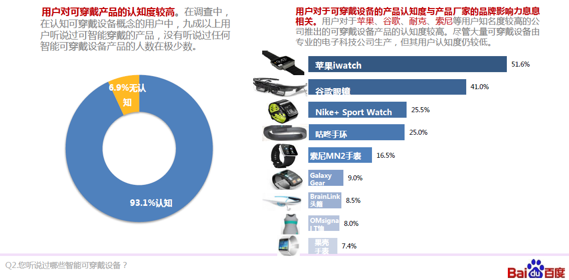 百度公司剛剛公布了一份由百度云創新實驗室與國際調研公司聯合制作的《可穿戴設備用戶需求調研報告》,在“可穿戴設備”的產品認識度上,蘋果 (Apple) iWatch 和谷歌眼鏡分別排名第一、二名,占比分別為 51.6% 和 41.0%。其它認知度較高的“可穿戴設備”還有 Nike+Sport Watch 手表、咕咚手環、索尼 (Sony) MN2 手表、三星 (Samsung) Galaxy Gear 手表、BrainLin 頭箍、Omsignal T 恤,以及果殼手表,用戶對可穿戴設備的購買意愿非常高。