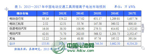 在電動(dòng)自行車市場(chǎng),鋰離子電池正在規(guī)模化取代鉛酸電池。真鋰研究預(yù)計(jì),無(wú)論是全球還是中國(guó),今后幾年該市場(chǎng)的鋰離子電池用量將會(huì)以90%~100%的年增速成長(zhǎng),到2016年基本完成替代鉛酸電池的過(guò)程。全球電動(dòng)自行車產(chǎn)能90%以上集中在中國(guó),這一狀況即使未來(lái)多年內(nèi)也很難改變。預(yù)計(jì)到2017年中國(guó)電動(dòng)自行車對(duì)鋰離子電池的需求量將高達(dá)1,637.76萬(wàn)kWh,是2012年的19.69倍;不過(guò),其占整個(gè)中國(guó)電動(dòng)交通工具用鋰離子電池需求總量的比重將降到25.06%。