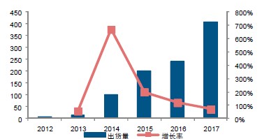 圖7:2012-2017全球可穿戴設備出貨量(百萬臺)