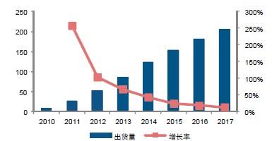 圖6:2010-2017全球智能電視出貨量(百萬臺)