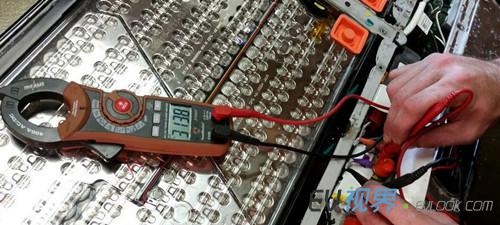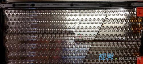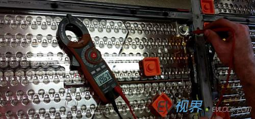 5.單個電池模塊俯瞰圖 6.將電壓表接上主觸點的hot side部分,即可讀取整個電池組的電壓——313.8V。 7. 單個電池模塊電壓196.3V 8. 近距離觀察電池組的主保險