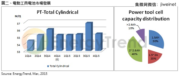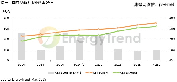 TrendForce旗下綠能事業處EnergyTrend研究經理呂理舜表示,隨著環保意識的興起,電動自行車與電動汽車在市場的普及度逐漸增加,亦帶動圓柱型動力電池在移動載具需求將從去(2014)年的1.11億顆成長至今(2015)年1.45億顆,年成長30%;而整體圓柱型動力電池需求將從去年的8.82億顆成長至今年的11.71億顆,年增率為32%。