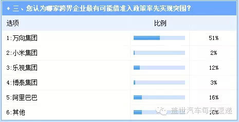 另外,已經(jīng)分別與上汽和北汽兩大整車(chē)廠(chǎng)合作的國(guó)內(nèi)互聯(lián)網(wǎng)巨擘阿里巴巴和樂(lè)視是另外兩個(gè)支持率在兩位數(shù)的企業(yè),分別占比16%和12%。