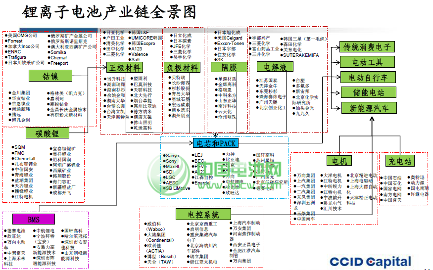 可以說,這是迄今為止對鋰離子電池產業鏈梳理最清晰、最具價值的全景圖,從上游的礦業材料、四大材料到中游的電芯和PACK么再到BMS、電控系統、電機、充電站,最后到市場終端應用,真可
