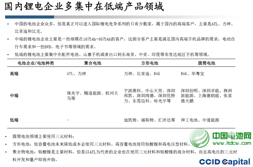 中國的電池企業(yè)眾多,但是真正可以進入國際鋰電競爭系列的只有少數(shù)家,屬于國內(nèi)的高端客戶,主要是ATL、力神、比亞迪和比克。